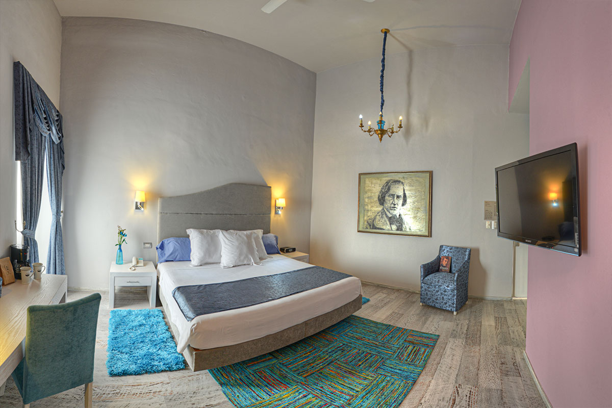 Hotel Andante comisionó a 31 artistas contemporáneos poblanos para que reinterpretaran a cada uno de los genios musicales a quienes se les rinde homenaje en cada una de las 19 suites, el resultado es un maridaje de música, formas y color sin igual. Esta es la habitación dedicada a Frédéric Chopin, intervenida por el artista plástic0 Aziza Alaui.